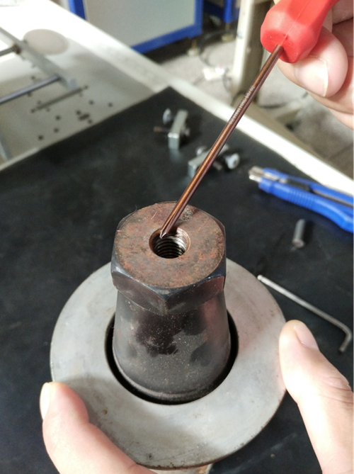 1.振子端的斷螺絲,機器通電,點動發振箱的音波檢測按鈕,振子產生振動后斷螺絲會被振出來。同時可以用小螺絲刀逆時針受力于斷螺絲把它導出來。